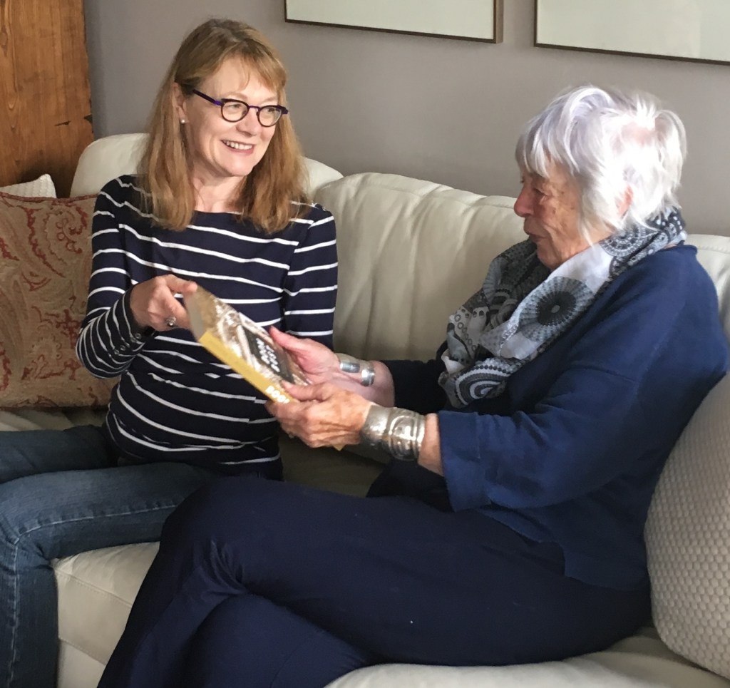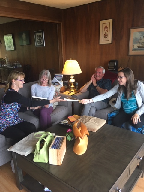 first copy to my mother of course!this woman knows hoe to live!2 at one time – and a third to be passed onTouchwood Editions author to TouchWood Editions authorsomeone instrumental in helping me with information for one of the schoolteacherssome women are so busy the delivery had to be made on a highway pull-outsome deliveries were very emotional, and needed tissues at the readyappropriate backdrop of a new Telegraph Cove paintingdelivering to a woman I had never actually met before this momentin a coffee break at workappropriately in a family kitchen between work day and social eveningdelivering to a woman who I have looked up to all my lifedelivering to a small island means getting to stay and visit all day until the next ferryanother quick pass during a short work break in the back laneto the oldest woman from the book still living – 90 this summer!Impossible not to look elegant when in this apartment – I even have orchids coming out of my head!