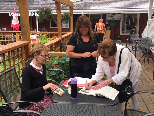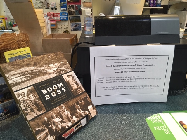 Stationed at the Telegraph Cove General StoreReading to a spread out group of wonderfully enthusiastic visitorsmeeting and signingAnd over there…..One of the women in the book, Lorraine Wallz, was there to chat and sign as wella little walking tour of the Coveseagulls enjoying the tourso happy to be here this sunny day!new buildings to add to the old