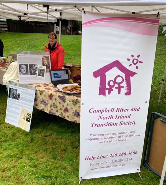 Haig-Brown House, heritage home of author/environmentalist Roderick Haig-Brown and his wife librarian/humanitarian Ann Elmorerain at the beginning…..then glorious sunshine!at the table of the Campbell River North Island Transition Society, one of the two charities my royalties of this print run are being donated toabout the women whose name is attached to a shelter for at-risk women and children, now part of the CRNITSmy book for sale, along with Roderick Haig-Brown’s books, by the Campbell River Museum