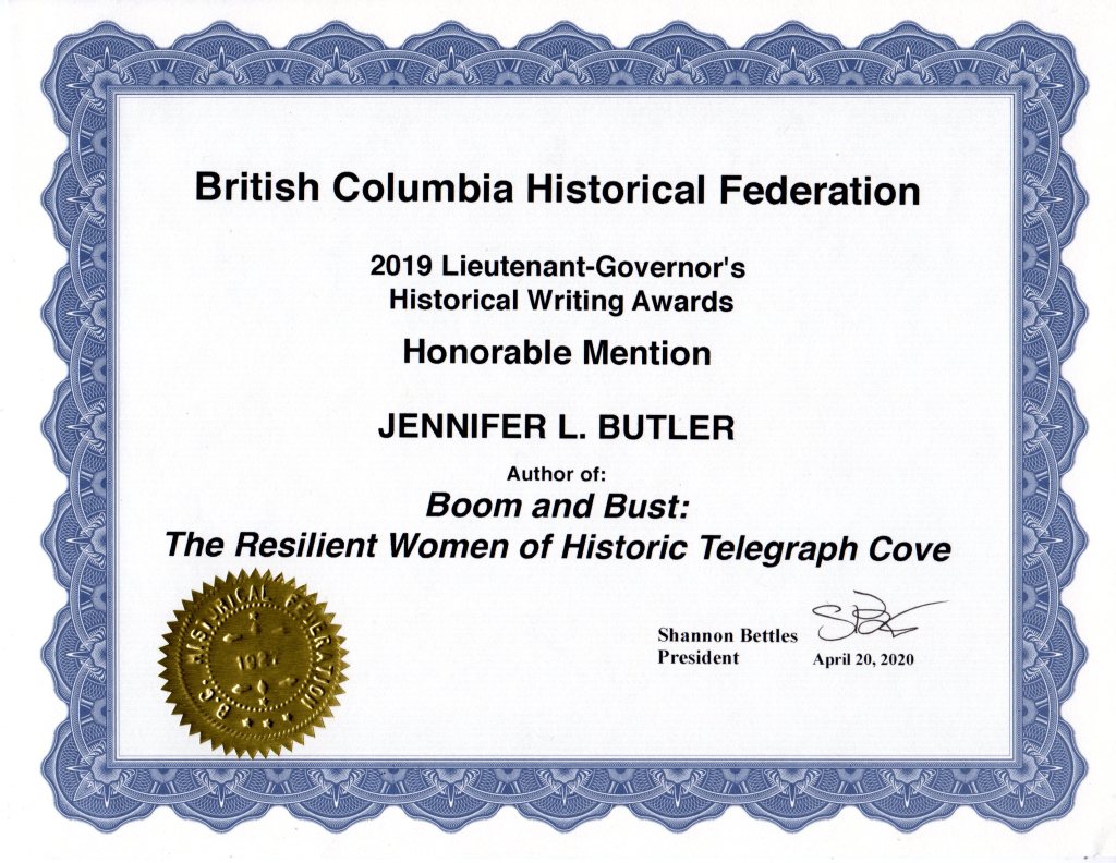 Boom & Bust: The Resilient Women of Historic Telegraph Cove is awarded an Honorable Mention for being one of “the most significant contributions to the historical literature of British Columbia”
