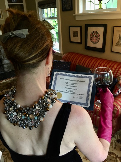 With no book awards galas this year due to COVID-19, I decided to dress up and make a long-winded acceptance speech to my couch. Thank you to the resilient women of Telegraph Cove, TouchWood Editions, my husband, my mother….. and Blue Mountain Winery. Cheers!